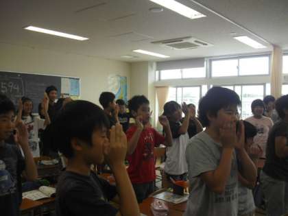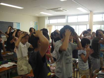 歌に合わせて体の部位に触れながら、英語に親しむ活動中でした。音楽がゆっくりしたものから急にテンポがアップして・・・うまくリズムについていけなくなってきましたよ・・・