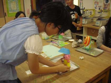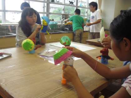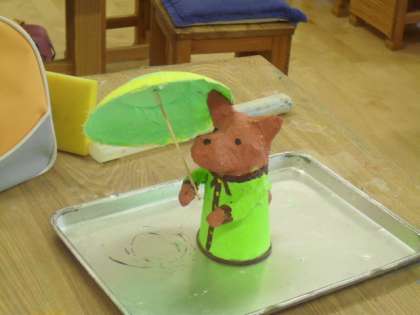 廊下に展示されている傘とレインコートを着た動物達のはりこ達・・・ 今日も頑張って仕上げに入ります。それぞれの個性の輝く作品になりましたね・・・。