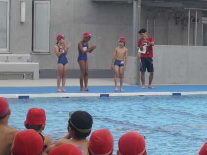 今日は曇り空でしたが、気温、水温が実施基準に達したので、待ちに待った4年生のプール開きを行いました。代表児童が今年の目標を話し、皆でプールにも挨拶をして、プールで何か起こった場合に備えての避難訓練を実施したのち、いよいよ入水です。この夏、思いっきり泳げる日がたくさんありますように・・・・。