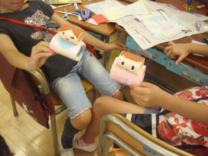 絵の具をにじませて作った模様の紙で体を作り、今日は顔を取り付けます。ステープラー(ホッチキス)の使い方にも慣れる練習です。かわいいお人形さんができ上がってきました。