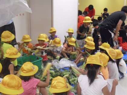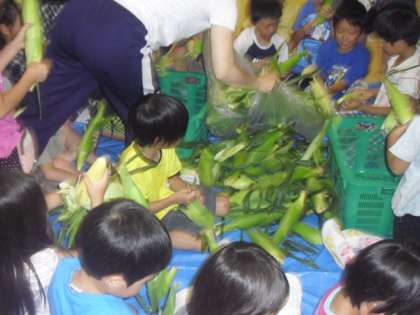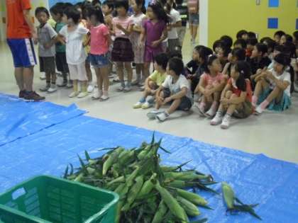 給食室前にとうもろこしの山がたくさん・・・今日は1年生が皮むきに挑戦します。1年生がむいてくれたとうもろこしは今日の給食に登場予定です。中学生の分までしっかりお願いしますね!
