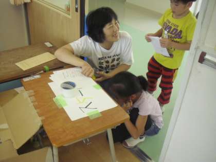 。教室にはみんなで作った大きな迷路が完成しています。作った後は、楽しむ活動です。みんな順番に入口からもぐりこんでゴールを目指して、ごそごそ進んでいきます。途中でスタンプも押してもらって、ゴール・・・楽しんだ後はもちろん、みんなでお片付けです。ダイナミックな活動でした。