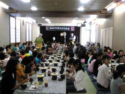 キャンプファイヤー中に降り出し、夜中まで降り続いた雨もすっかりあがり今日もよい天気です。宿の方たちに心を込めてお礼を言い三日めの行程に出発しました。現在バスは大笹牧場を目指し山道を進んでいます。六方沢大橋の高さに驚きチェーンソーアートの素晴らしさを感じながらバスは進んでいます。