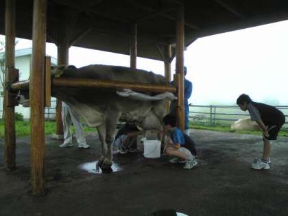 いよいよ最後の大笹牧場です。ここでは搾乳とバター作りを体験しました。牛は優しい目をしていておとなしくとてもかわいかったです。作りたてのバターもクラッカーにつけて食べました。とても美味しかったです。ジンギスカンも食べてお腹も満足です。これから東京を目指して出発します。全員元気です。