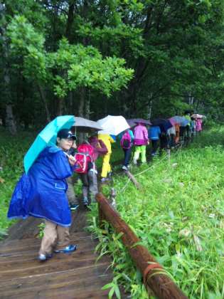 竜頭の滝の駐車場から戦場ケ原をハイキング、途中から雨が落ちてきて、傘をさして木道を歩きました。雨足がだんだん強まり、湯滝目指して進みました。