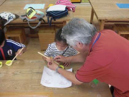 同窓会会長、松田 昭夫様の「おはしの使い方をマスターしよう」講座も