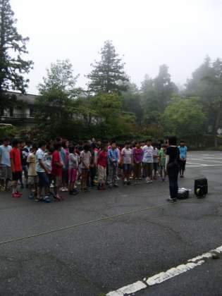 おはようございます。昨夜は子供達はぐっすり眠っていました。3日目の朝は天気予報は一日雨ですが、今は降っていないので、近くの駐車場に移動して、朝の会を行いました。朝の健康観察でも皆元気でいます。