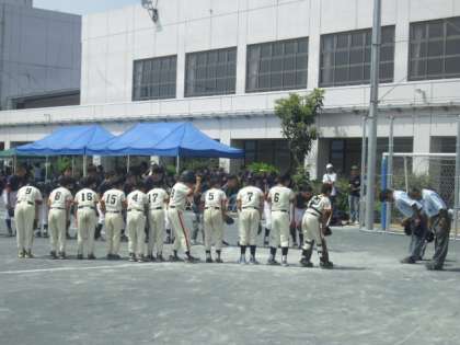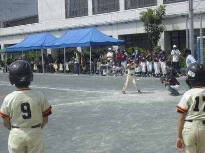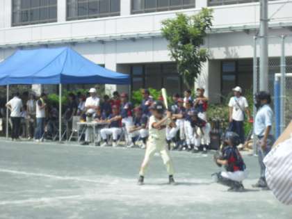 今日は芦花小学校の校庭で、青少年烏山地区委員会主催の「烏山地区少年野球大会」が開催されました。烏山上町、烏山ウイングス、ムサシクラブ、芦花ベア—ズが参加しての試合です。第一試合で、普段芦花小学校の校庭で練習している芦花ベアーズAがムサシクラブと対戦しました。