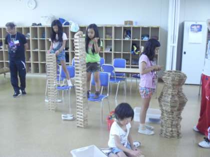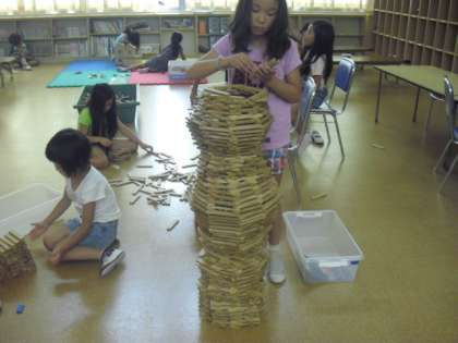 土曜日のBOPをのぞくと、みんなで棒状の積木を高く積み上げる遊びに挑戦していました。自分の背丈を超え、いすを利用してチャレンジしています。また面白い形に上手に積み上げていて・・・、思わず「ぱちり」と写真におさめました。根気強い作業ですが、その高さまでよく頑張りましたね〜。
