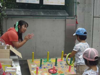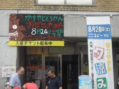 8月24日には粕谷区民センター運営協議会主催、粕谷児童館、粕谷図書館共催の夏休み夕涼み会が粕谷区民センターで行われました。子どものお店「ゲームやさん」では、PTAの方々が射的、輪投げコーナーで楽しいお店を運営してくださいました。「おばけの館」では子どもたちがお化け役となり小道具を動かして、入場者を驚かせていました。