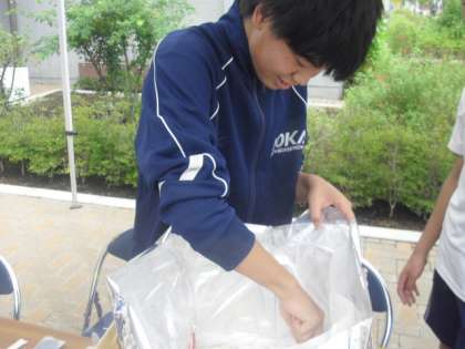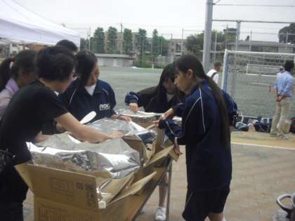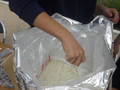 箱に入ったアルファー米に8リットルの熱湯を注ぎふたをして15分・・・50食分のご飯が炊けます。中学生が炊き出しの訓練です。アルファー米は芦花小学校、芦花中学校の防災倉庫にも入っています。避難所運営委員の担当の皆さんも協力してくださいました。緊急時に芦花小学校が地域の避難所として開設された時にも、このアルファー米が活躍します。
