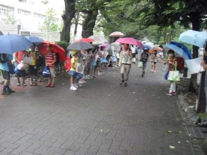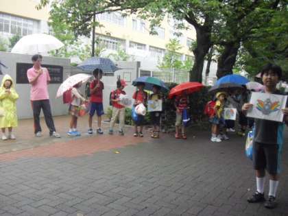おはようございます。今日は朝から雨になってしまいました。今日のあいさつ隊は3年生、傘をさしての挨拶運動です。みんなの元気な挨拶で、天気も晴れるとよいのですが・・・・