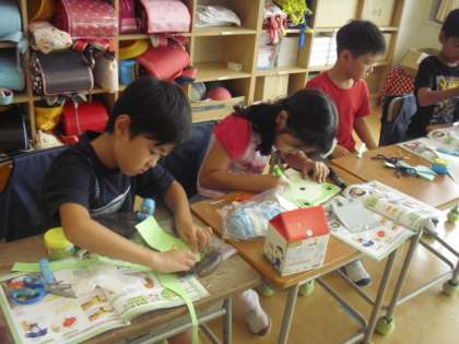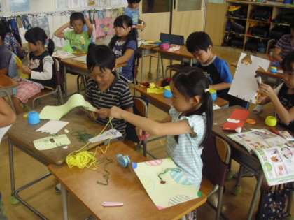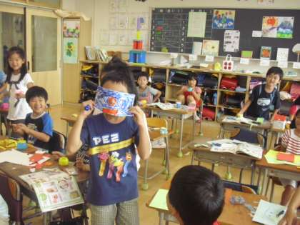 1年生の教室で、図工の学習が行われていました。紙を折ったり切ったり、手でちぎったり、飾りを付けたりして、思い思いの作品へと・・・鼻だけ見えるお面をかぶって「出来ました〜」とみんなに紹介していましたよ〜