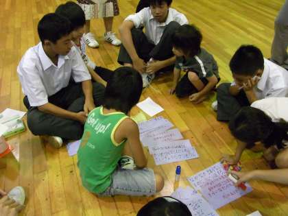 「勇気ってなんだろう」として中一と小二の道徳の合同授業を行いました。中学生にリードしてもらいながらいろいろな勇気について考えました。「けんかをしたときにあやまる勇気」「はじめての人にあいさつする勇気」「人を注意する勇気」など様々な勇気がでてきました。