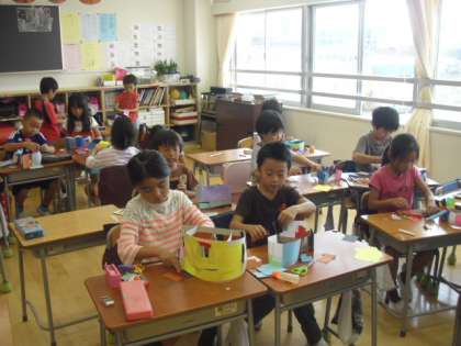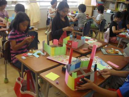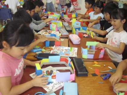 2年生の教室では小さな紙片を順番につなげて壁にしていく作業を展開中でした。子ども達の頭の中は想像の世界へ・・・、「ここが入口、鍵もかかります」「滑り台も付けました〜」と制作しながら思いをめぐらせ、作る楽しさを味わっていました。