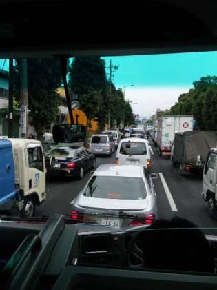 バスに乗って出発しました。環状八号線を走行中。やや渋滞しています。