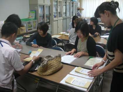 PTAルームでは、学年委員の方々が学校公開の受付担当案内を発送する作業を