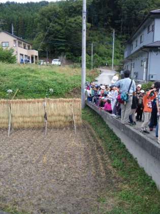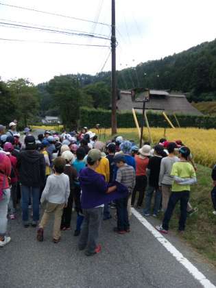 川のせせらぎを歩き、稲穂の刈り入れ風景に接し、茅葺き屋根の家のそばを通り、私達の普段の世田谷での生活とはまた異なる自然の中での川場村の生活を感じました。