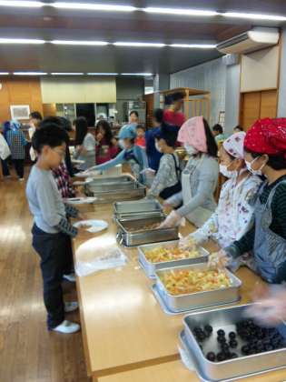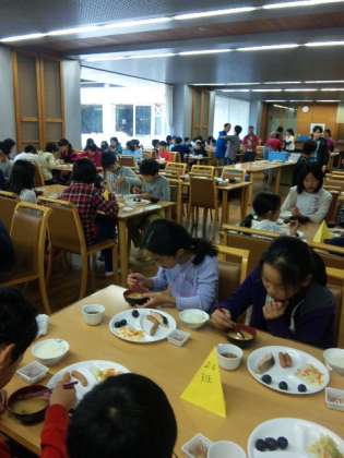 食事当番が配膳の準備を整え、朝食をいただきました。みんなで食べる食事、いつもより、おかわりをする子供も多いようです。みんな元気でいます。