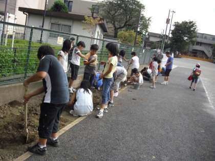 学校の中には目立たないけれど、とても役に立っている仕事があります。この委員会活動もその一つです。栽培委員会の人たちは、新しくできた東門のそばを花壇にしようと一生懸命です。土を掘り起こして畑を作っています。