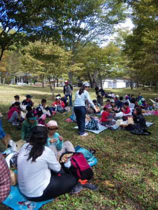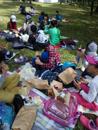 おにぎりとから揚げのお弁当を班ごとに食べました。この後はマス掴みに挑戦です。