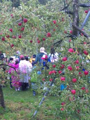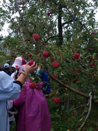 村巡りで訪れた関りんご園で搾りたてのりんごジュースを飲み、りんごのもぎ取りをしました。一人2個持ち帰るので家で味わってください。