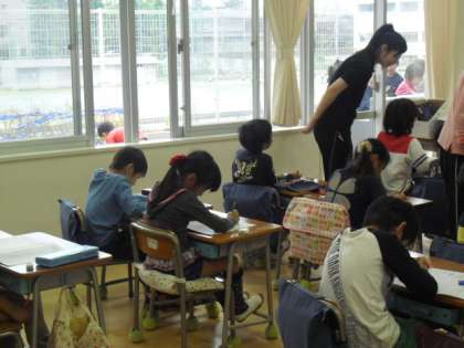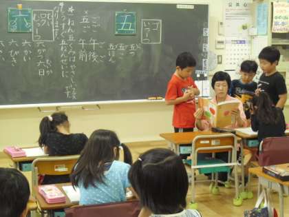 国語の時間には話すこと、聞くこと、書くこと、読むことの学習以外にことばや文字の学習も行います。入学して、ひらがなをしっかり覚えていきた1年生は、今では漢字もしっかり練習しています。今日は、五、と六について、書き順や言葉の使い方を練習しました。みんな練習帳に丁寧に練習しています。今日も大きな花丸が先生にもらえるとよいですね。