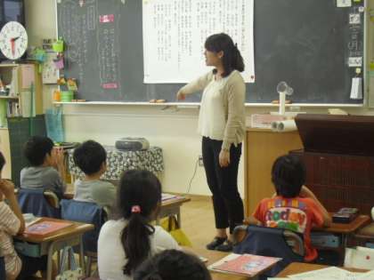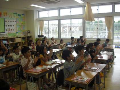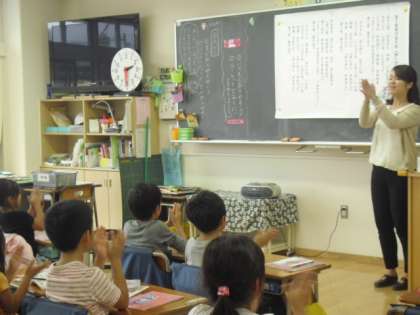 今日の1年生の音楽の時間には学芸会で歌う「幕をあける歌」を練習する歌声がきこえてきました。おなじみの手をたたいて・・・のフレーズでは、リズムよく手拍子をうっていましたよ・・・