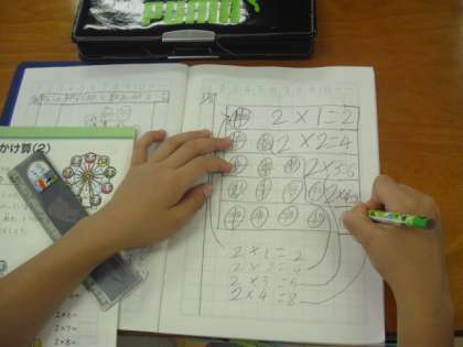 2年生はただいまかけ算九九の学習中、今日は2の段の九九を観覧車に2人ずつ乗っていいる場面を使いながら、いくつずつ増えているか考え、作って行きました。ノートにも自分の考えがうまくかけたかな・・・