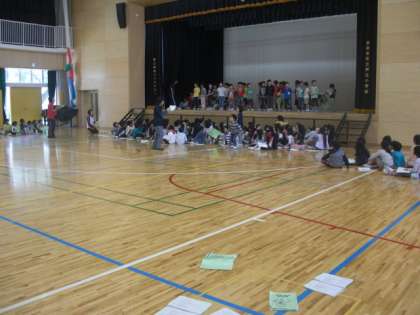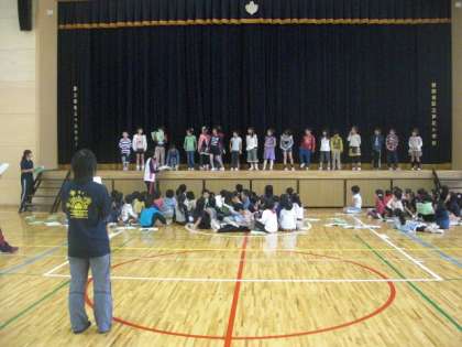 1年生「芦花の森の動物会議」の学年練習を体育館で行っていました。
