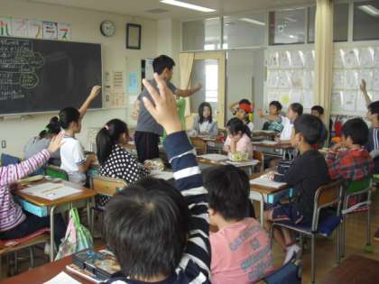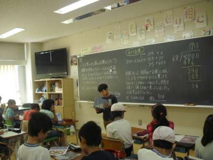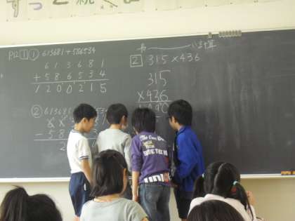 算数の時間に4年生が計算の仕方について考えていました。今までに習った計算のきまりを使って解決したことを発表したり、考えている途中での気付きを皆で話し合ったり、みんなの力を合わせて大きな数の計算にチャレンジしたり・・・・・それぞれのクラスで工夫した活動が展開されていました。