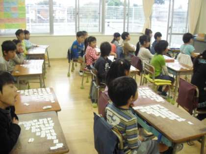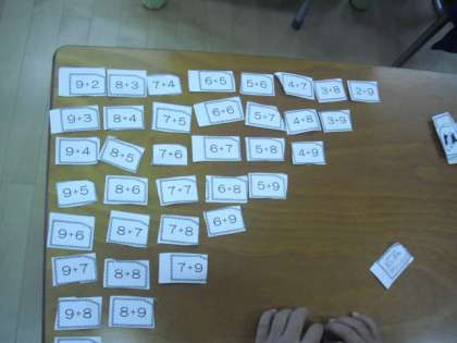 1年生の算数の時間です。答えが同じになる算数のたし算の計算カードを机に整理して並べてみたら・・・・・、たくさんのおもしろい数字の並び方が見えていましたよ。