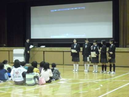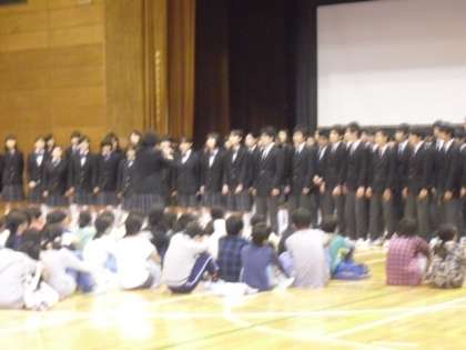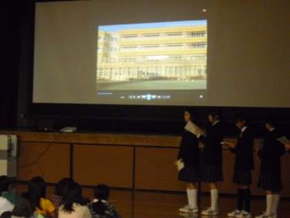 体育館では昨年度の周年記念式典の際に芦花小の小学生と一緒に歌った合唱コスモスと、本年度の合唱の3年生の課題曲が披露されました。美しい歌声にみんなうっとりしていました。その後、生徒会の役員が芦花中の学校紹介をしました。中学校生活も今から楽しみですね。
