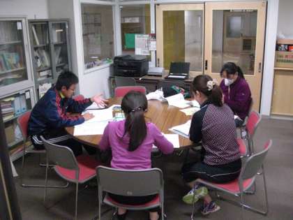 幕の開閉タイミングを話し合う3年生担任の先生方(写真:中)