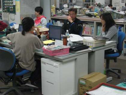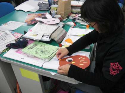 特技を活かして、せっせと動物お面を作る青山先生(写真:下)