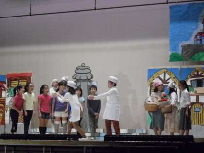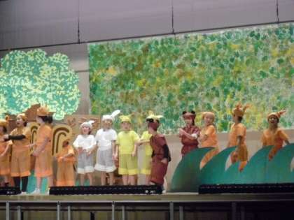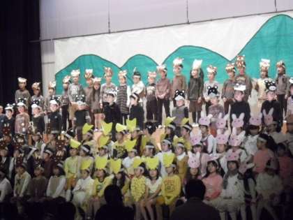 4年、1年、ひかり学級のワンショットです。みんな楽しく演じています。