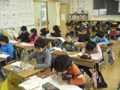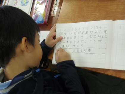 算数の時間に学習のまとめで、ひき算の問題づくりをしていました。カブトムシ、アイスクリーム、お花など身近な材料を使って残りはいくつ?になる問題を作り、式と答えもノートに記入していました。「もう3問も作ったよ」と得意そうにノートをみせてくれましたよ・・・・楽しく活動しながら、ぐんぐん力をつけてほしいです・・・