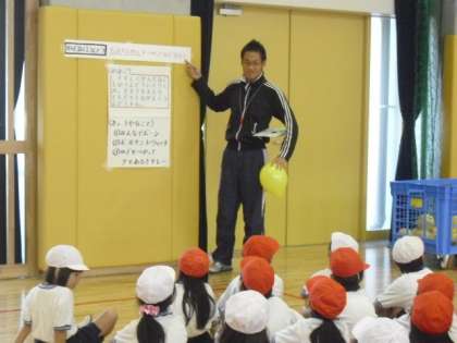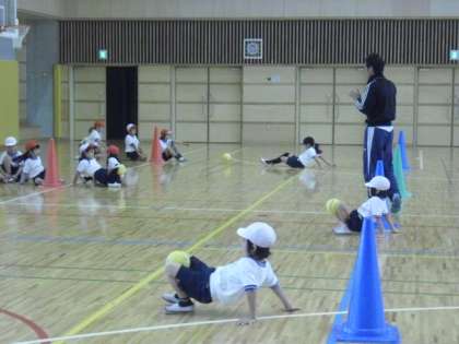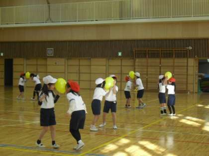 体育館では道具を使って体ほぐしの運動が行われていました。今日の目当てを確認して、風船を友だちと運んだり、普段なかなか行わないくも歩きをしたり・・・友だちと自然と協力したり、頑張れ〜の応援がわきおこったりと楽しい活動になりました。