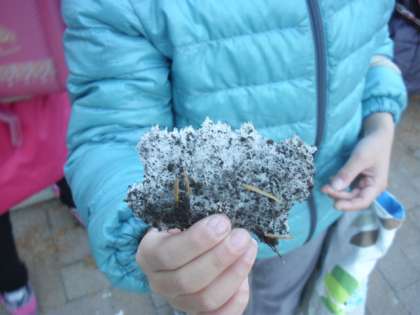冬の寒さを感じる今日この頃です。学校の花壇の土にも霜柱が・・・・登校してきた子ども達も駆け寄ってきます。「こんなにこおっていたよ・・」と霜柱を見せてくれました。「葉っぱもこおっています。」と・・・・冬にしか見ることのできない体験の一つですね。道で見つけても「さくっさくっ」と踏みしめる感覚を味わっていることでしょう。