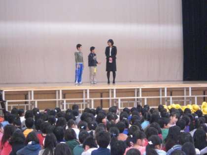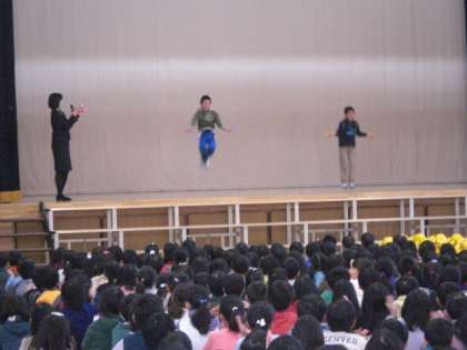 なわ跳び名人の4年生二人を舞台に上げて