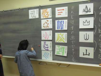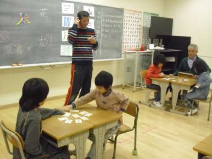 漢字が縦線、横線、斜め線等の組み合わせででできていることから、習った漢字について確認、その後は個別に漢字プリントに挑戦・・・最後に漢字のかるたとりです。先生の読み札に書かれているお話に合った漢字の札をとります。勝負は接戦でしたよ・・・。