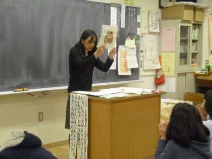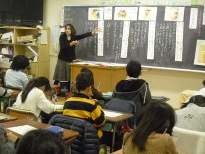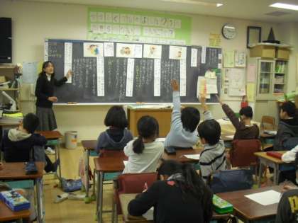 3年生の教室では、先生が紙芝居形式になった「泣いた赤おに」の話を読み聞かせ、場面ごとに赤おに、青おにの気持ちについて考えさせました。みんな考えたことを発表し、聞き合いながら、互いに相手を理解し信頼し合い、友情を深めていこうとする心情を高めていました。