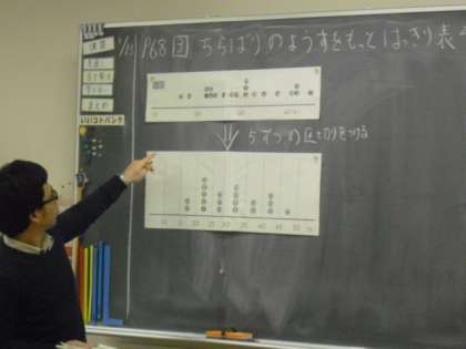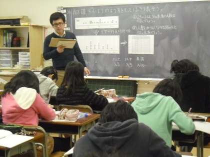 算数少人数教室では6年生が、散らばりの様子を見やすく整理するにはどうしたらよいか学習していました。以前学習した ○以上〜○未満という区切りごとに個数を整理し、結果を表にまとめていきました。算数で学習したことが、日常生活や他の学習場面でもし活用していけるとよいですね。