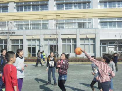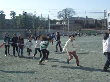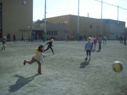 日ざしが届くと子どもたちの元気ボタンにもスイッチが入ります。5分間に何回跳べるか、みんなで長縄跳びにチャレンジしたり、ボールを使って地面に落とさないようにつないだりと、一つの遊びをきっかけにみんなの仲間意識も高まっている様子です・・・