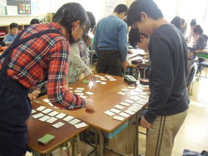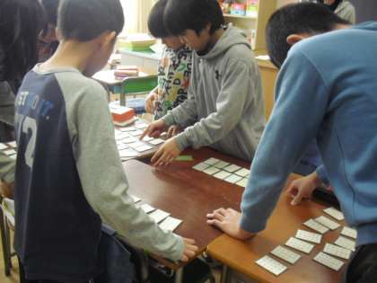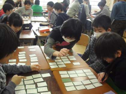 6年生の教室では、教科日本語の時間に班ごとに百人一首をしていました。上の句を聞いてすぐ札をとる児童もいて、みんな必死です。今日は何枚とれたでしょうか・・・