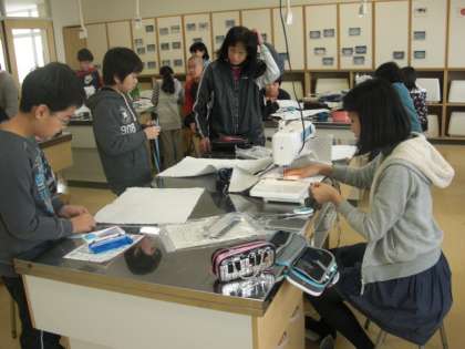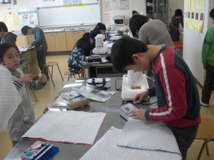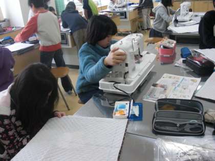 男子も女子も、真剣に手縫いし、ミシンがけしていました。