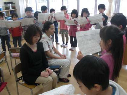 目隠しして4組の子どもたちが囲む椅子に座ると