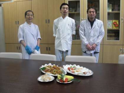 栄養士の箱崎さんとレパスト調理員の方々です。