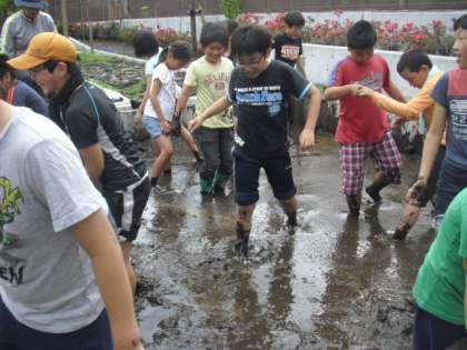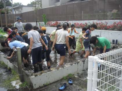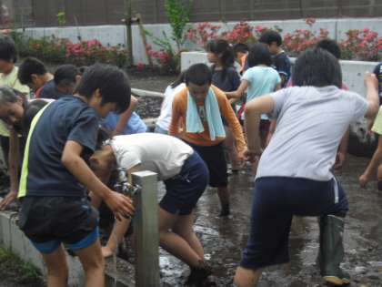 昨年の夏にはメダカたちがたくさん増え、泳いでいた芦花小の田んぼ、いよいよ今年も田植えに向けての5年生の準備が開始しました。何だかみんなで足の裏のぬるっとした感触も楽しんで活動していましたよ〜。