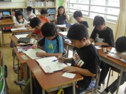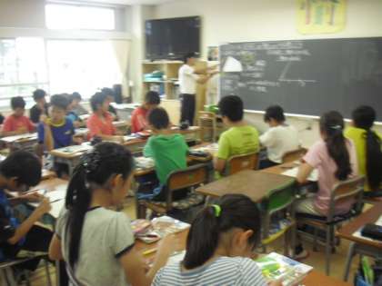 合同な図形と角の学習をしている5年生、今日は既に学習した合同な三角形の書き方を活かして4つ目の頂点の位置を決定する学習をしていました。先生のノートには綿密な授業計画・・、どのように児童に問いかけようか、発問や板書の計画が記入されています。なかなか計画した通りに進まないこともありますが、子ども達のつぶやきを拾い、授業の中で活かしながら、活動を通して、どう考えて新しい問題を解決していったらよいのかを学習していました。